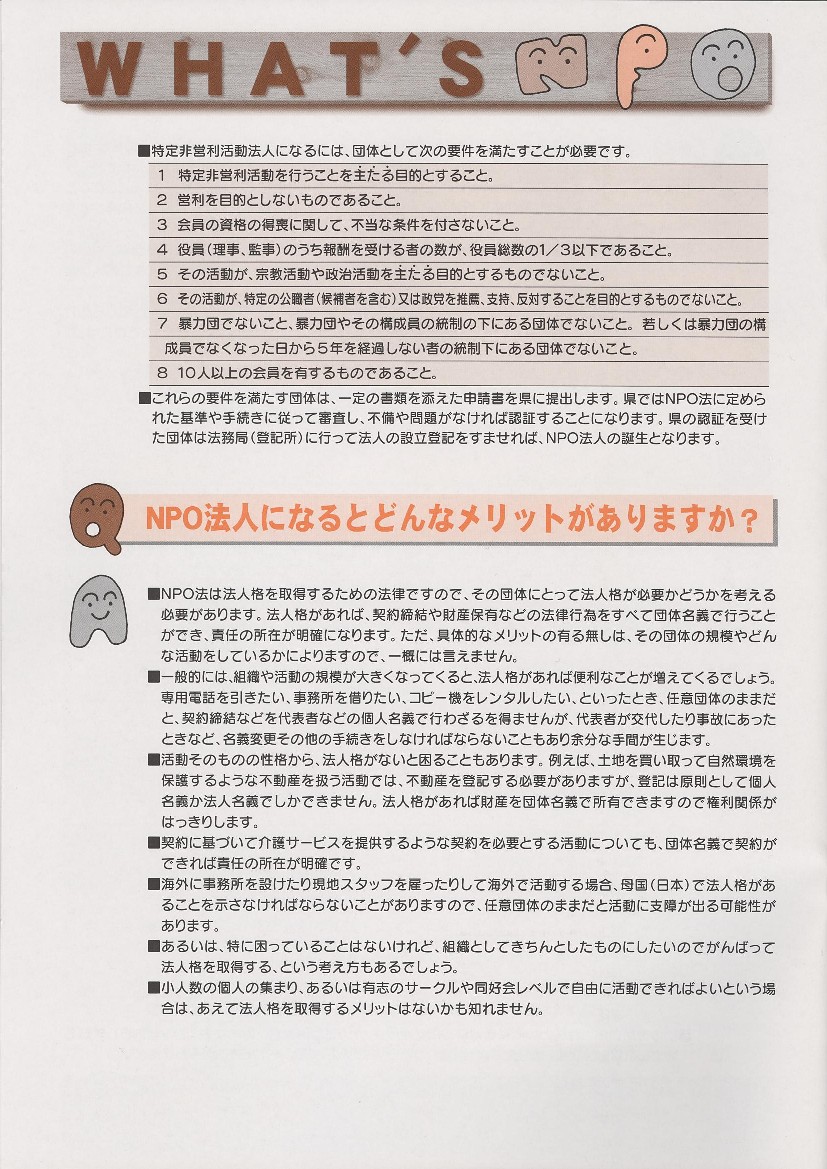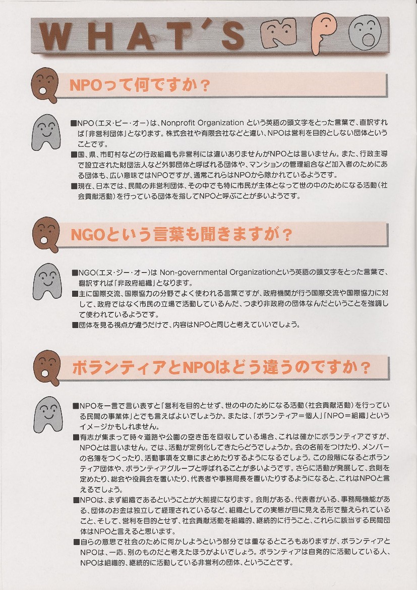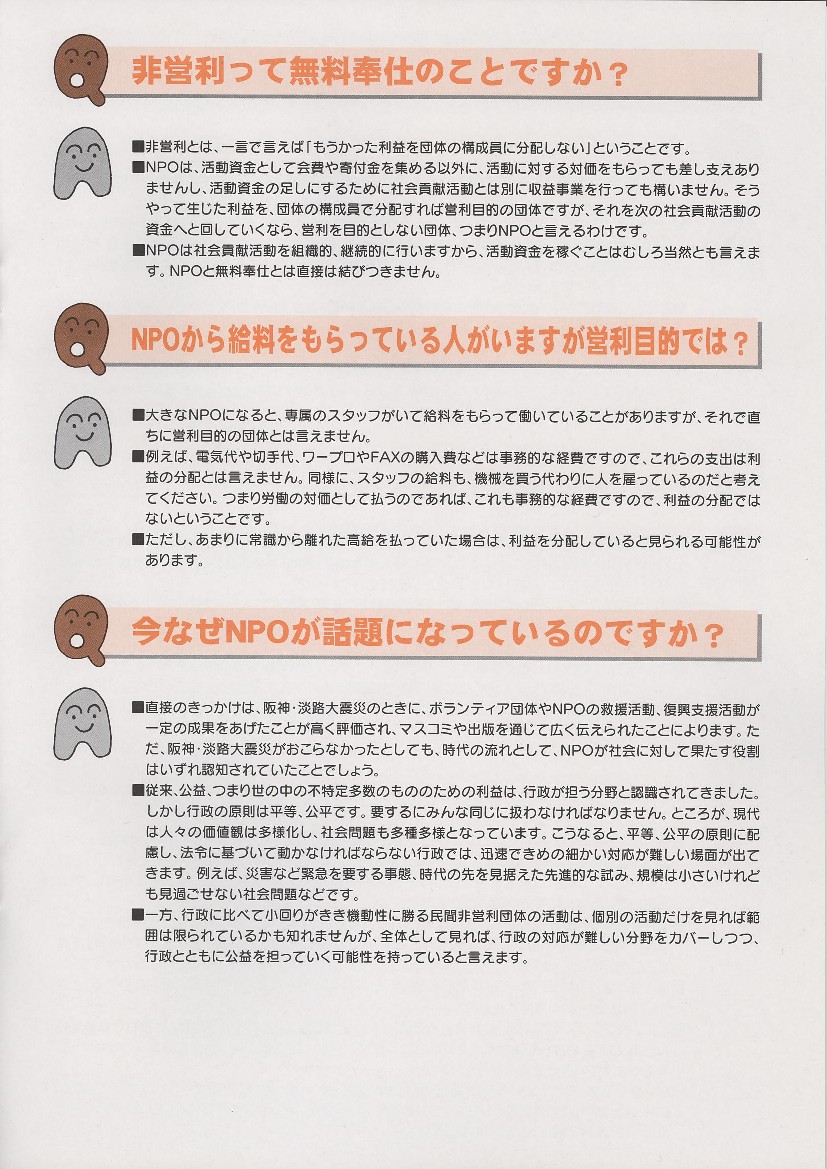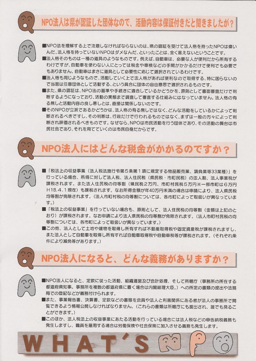 表紙 ・NPOって何ですか? ・NGOという言葉も聞きますが? ・ボランティアとNPOはどう違うのですか? ・非営利って無料奉仕のことですか? ・NPOから給料をもらっている人がいますが営利目的では? ・今なぜNPOが話題になっているのですか? ・市民活動は住民運動とは違うのですか? ・NPO法とはどんな法律ですか? ・法人格ってどういうことですか? ・法人格ってどんな役に立つのですか? ・どんな団体がNPO法人になれるのですか? ・どんな団体がNPO法人になれるのですか?〈続き〉 ・NPO法人になるとどんなメリットがありますか? ・NPO法人は県が認証した団体なので、活動内容は保証付きだと聞きましたが? ・NPO法人にはどんな税金がかかるのですか? ・NPO法人になると、どんな義務がありますか? ・どんなNPO法人があるか知りたいのですが?