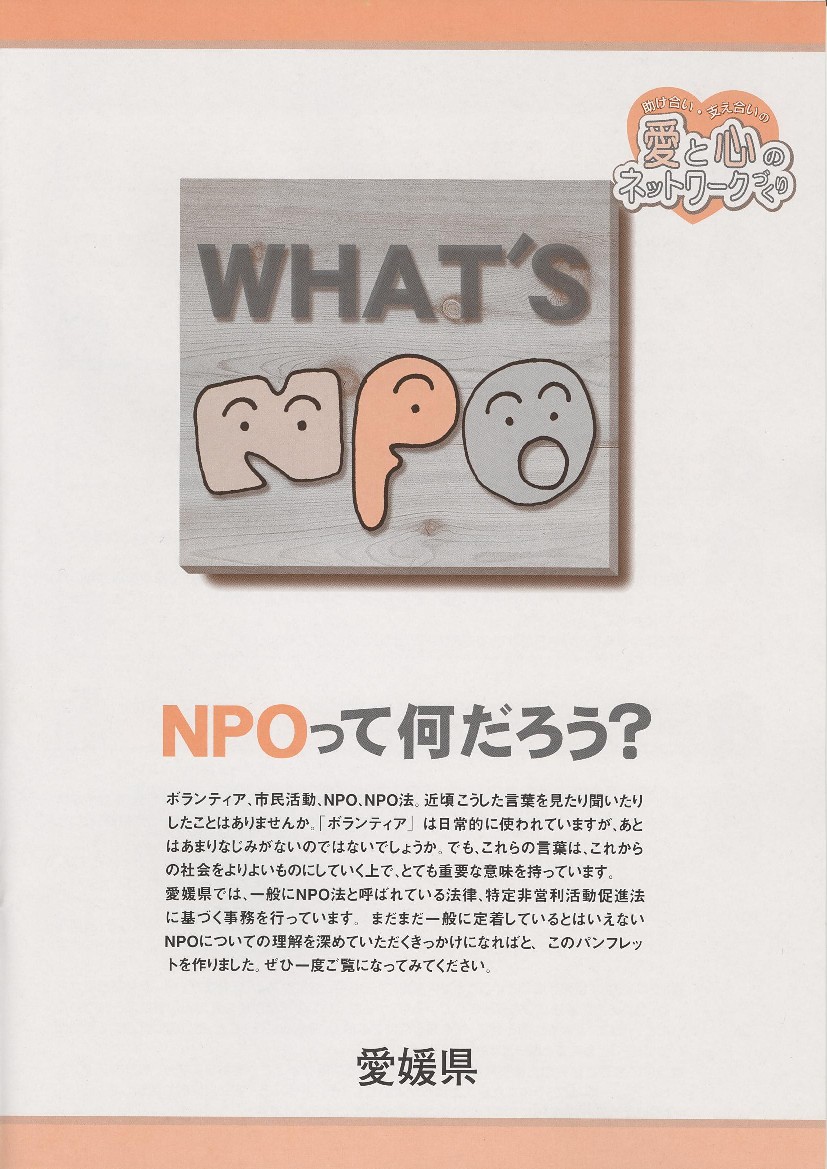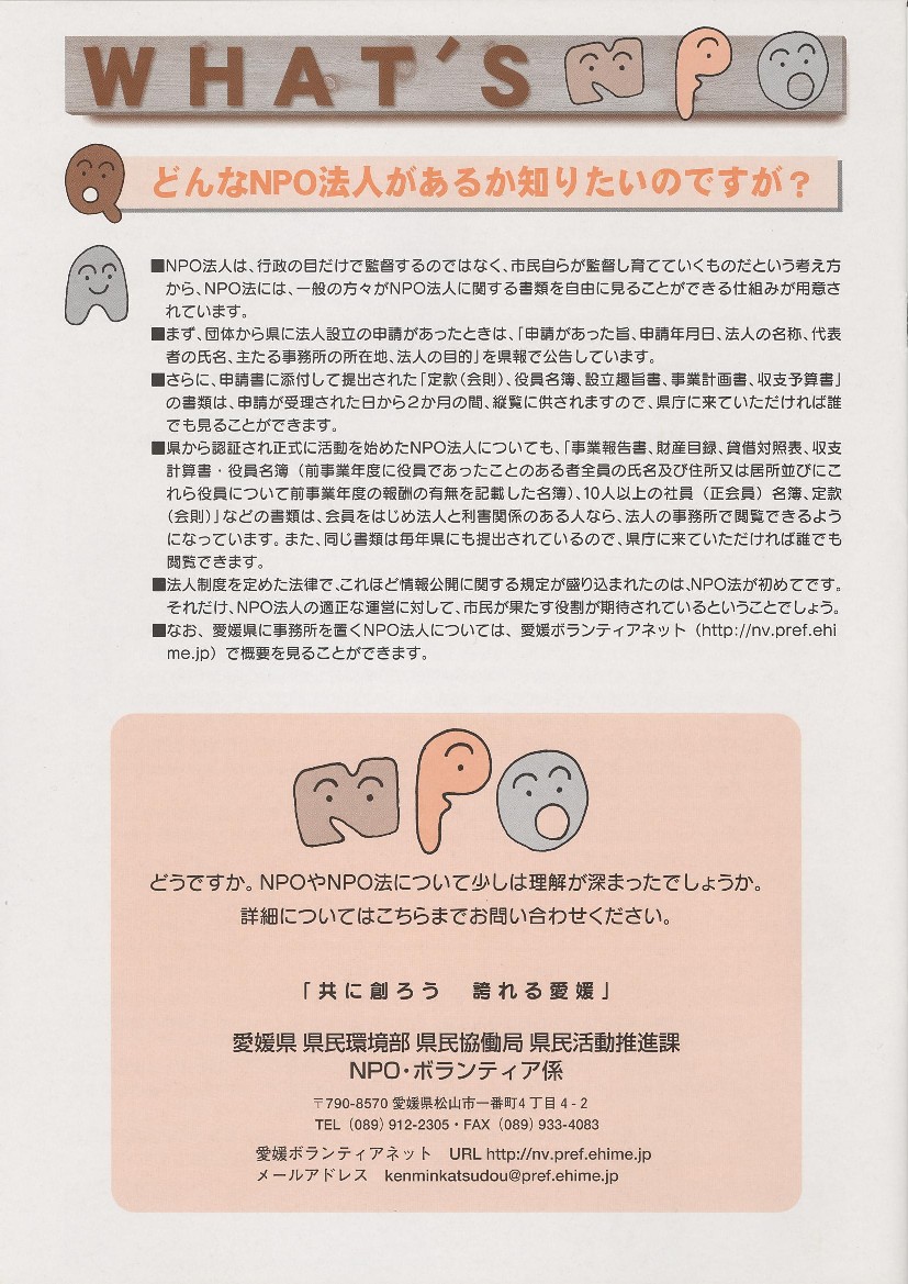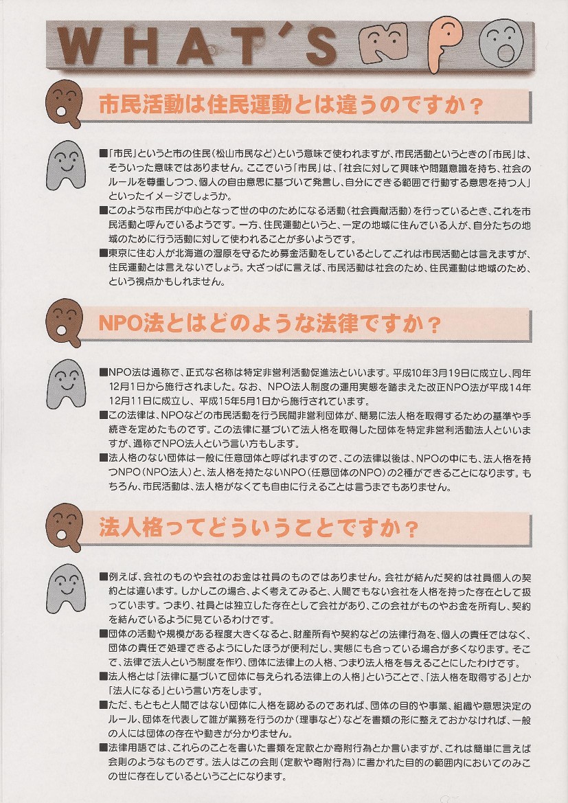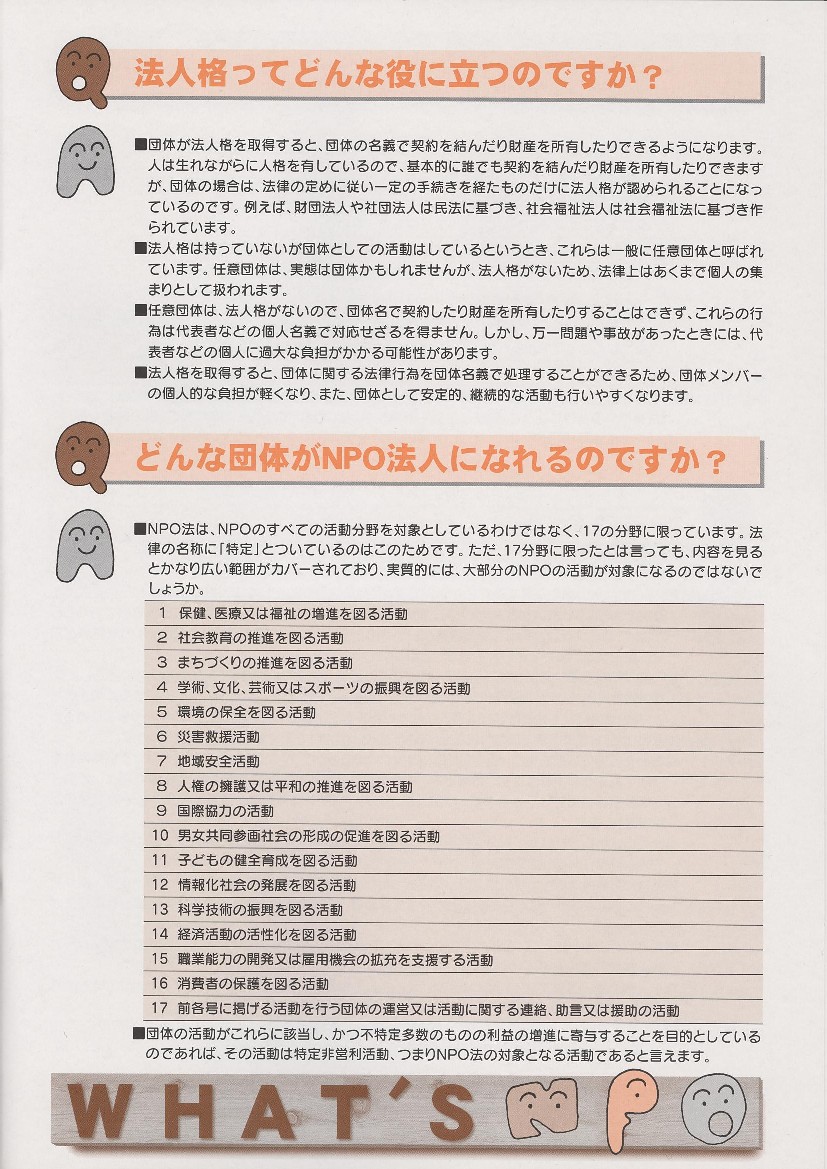 表紙 ・NPOって何ですか? ・NGOという言葉も聞きますが? ・ボランティアとNPOはどう違うのですか? ・非営利って無料奉仕のことですか? ・NPOから給料をもらっている人がいますが営利目的では? ・今なぜNPOが話題になっているのですか? ・市民活動は住民運動とは違うのですか? ・NPO法とはどんな法律ですか? ・法人格ってどういうことですか? ・法人格ってどんな役に立つのですか? ・どんな団体がNPO法人になれるのですか? ・どんな団体がNPO法人になれるのですか?〈続き〉 ・NPO法人になるとどんなメリットがありますか? ・NPO法人は県が認証した団体なので、活動内容は保証付きだと聞きましたが? ・NPO法人にはどんな税金がかかるのですか? ・NPO法人になると、どんな義務がありますか? ・どんなNPO法人があるか知りたいのですが?